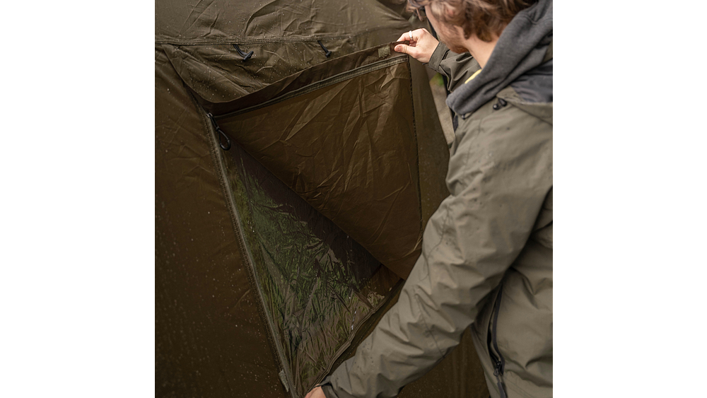 A configuração da porta lateral permite que os bivvies sejam posicionados no abrigo